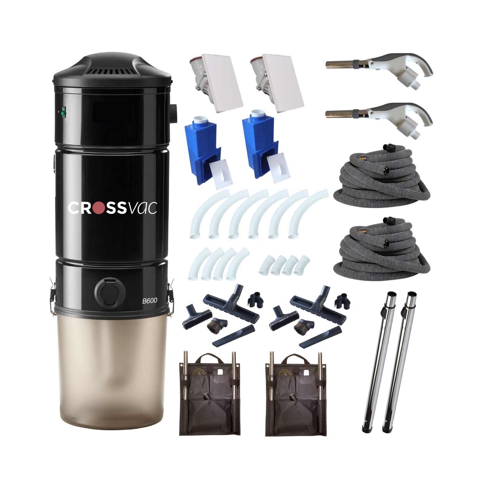 Zentralstaubsauger Set B600 Hide-a-Hose mit Staubsaugeranlage B600 und 2x Hide-a-Hose Schlaucheinzug sowie dem notwendigen Installationsmaterial, Saugzubehör & Co.